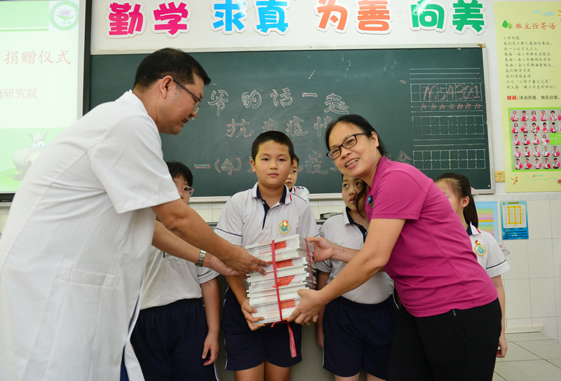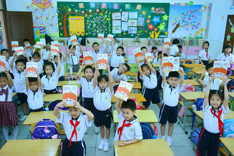 “出于對孩子的關(guān)愛,鐘南山爺爺?shù)膱F(tuán)隊(duì)‘國家呼吸系統(tǒng)疾病臨床醫(yī)學(xué)研究中心’為大家編寫了一本《不一樣的春節(jié)日記:鐘南山爺爺給學(xué)生的新冠肺炎防護(hù)手冊》。在這里,把這本書送給大家,希望大家認(rèn)真學(xué)習(xí)防疫指南?!卑鄷?huì)開始前,黃東明把一本本防疫手冊分發(fā)到孩子手中。據(jù)了解,共有400冊圖書分發(fā)到該校一二年級學(xué)生手中。