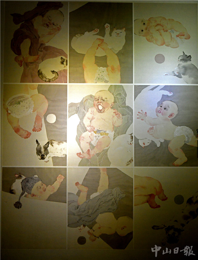 工筆畫中沒骨花鳥居多,人物畫少見,而用沒骨展示嬰兒的生動畫面更為難得,一筆自然暈開,雖不著線,卻并沒有軟弱無力之感,通過色彩的造型,點染孩童吹彈可破的肌膚和貓狗的生動情態(tài)。