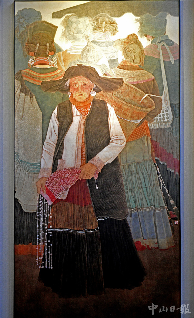 工筆畫按照著墨的多少又分線描、淡彩和重彩,此次展覽中重彩作品也不在少數,無論是《壯美惠安新氣象》(作者 高原 江蘇)還是《鷹之族·美姑》(周萍 北京),雖同為重彩卻各有不同,鮑老師說,前者利用天然礦物顏料為主要設色材料,畫面色彩絢麗卻并不凌亂,后者乍看凝重卻極為輕薄,作者畫工可見一斑。《壯美惠安新氣象》中,惠安女的衣紋也匯集了工筆的各種設色方式。