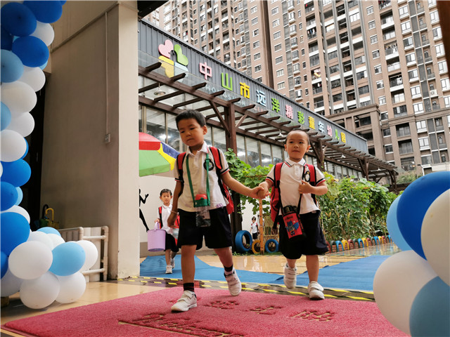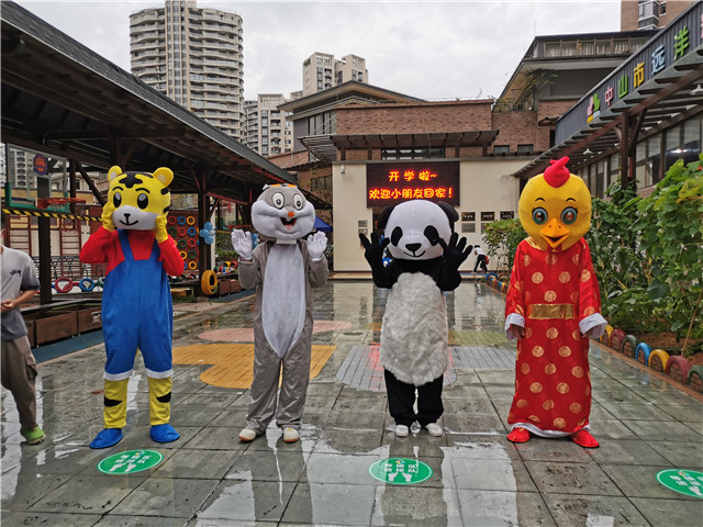 7點(diǎn)剛過(guò),中山市遠(yuǎn)洋精彩童年幼兒園的老師們,就在雨中撐著傘,等待返園的小寶貝。記者現(xiàn)場(chǎng)看到,園門(mén)口精心布置了氣球,還有穿著玩偶服的老師逗孩子們開(kāi)心。