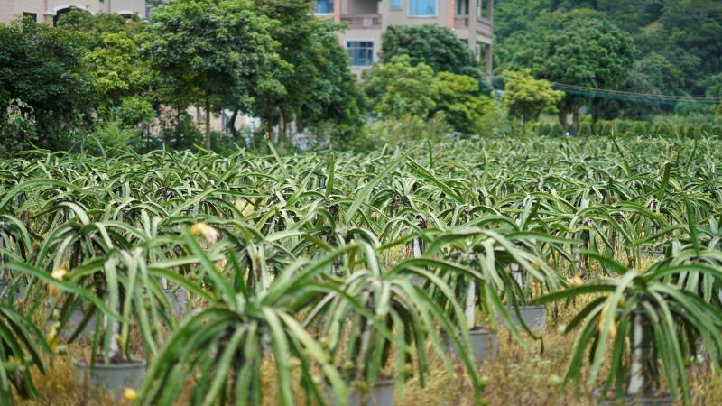 農(nóng)場里,火龍果漲勢良好,還未成熟,溫室大棚內(nèi)的西瓜正開著黃色的小花。