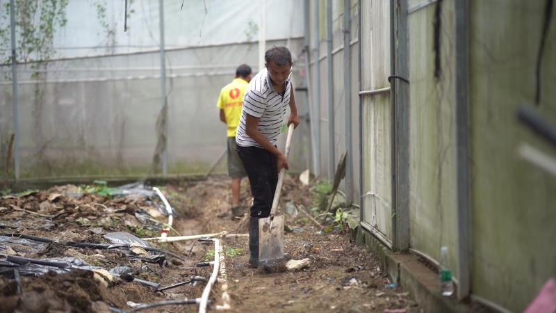 一位工作人員,正拿著鋤頭,在一大棚內(nèi)慢慢挖溝渠,“現(xiàn)在是龍舟水季節(jié),雨水多,地里的農(nóng)作物剛剛長起來不久,還比較脆弱,為了防止水浸,我們得搶抓農(nóng)時處理積水問題。”該工作人員表示。