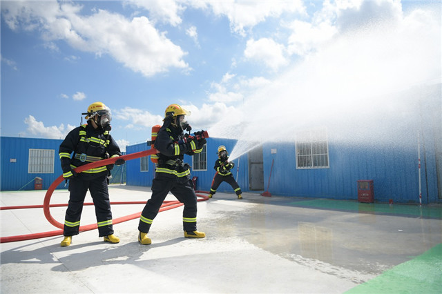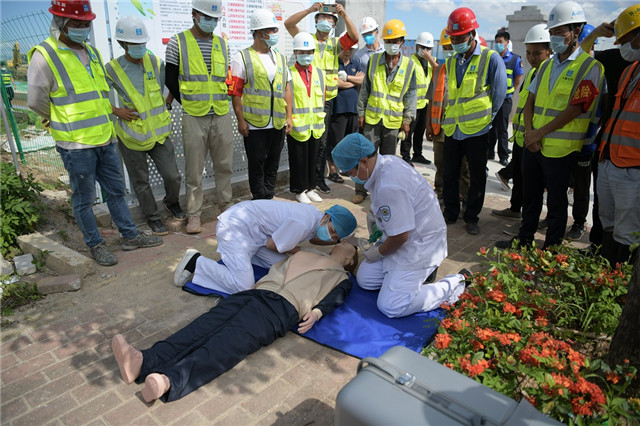 “著火啦,快滅火!”15時(shí)20分,橫三涌生活區(qū)一名工人大聲呼救,只見(jiàn)藍(lán)色的地工人宿舍區(qū)冒起了濃煙。專職安全員馬上打電話上報(bào)“火情”,消息迅速上報(bào),消防應(yīng)急救援預(yù)案隨之啟動(dòng)。事故搶險(xiǎn)組的工人們迅速趕往現(xiàn)場(chǎng)進(jìn)行初期撲救,警戒疏散組的人員則進(jìn)入現(xiàn)場(chǎng)開(kāi)始疏散人員,在他們的幫助下,“被困”的員工陸陸續(xù)續(xù)捂著口鼻從宿舍區(qū)走出來(lái)。幾分鐘后,一輛消防車?guó)Q著警笛呼嘯而來(lái),3名消防員迅速滾動(dòng)水管,對(duì)著宿舍的“著火點(diǎn)”噴射水柱。在消防員現(xiàn)場(chǎng)救援的同時(shí),一輛120救護(hù)車趕到現(xiàn)場(chǎng),兩名護(hù)士對(duì)“傷者”進(jìn)行人工呼吸,最終成功搶救“傷員”。