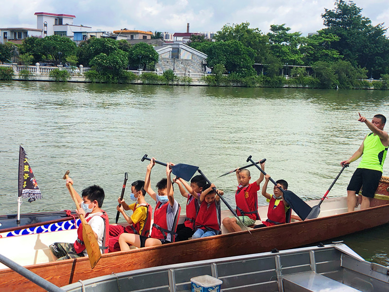 上午9點(diǎn),10對親子家庭精神抖擻地在大墩龍舟碼頭集結(jié)。鳳鳴社區(qū)非遺文化傳承志愿服務(wù)隊(duì)隊(duì)長周明鈞,向在場人員介紹了大墩龍舟的發(fā)展和“威水史”。緊接著,在父母的幫助下,10位小朋友穿上救生衣,排好隊(duì)伍走上龍舟開展體驗(yàn)活動。按位置坐好之后,小朋友們?nèi)耸治罩恢谪?fù)責(zé)人的帶領(lǐng)之下,開始學(xué)習(xí)如何劃龍舟。即使只是體驗(yàn)劃龍舟,但是小朋友們?nèi)匀环浅Ed,大汗淋漓也不覺得累。