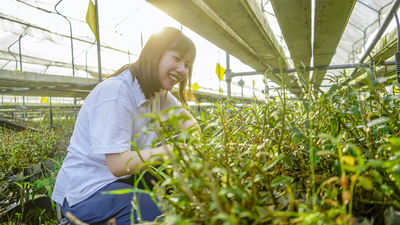 走進(jìn)華農(nóng)水培蔬菜基地的蔬菜大棚,盧楚琪正蹲著查看鐵皮石斛的生長(zhǎng)情況。7年前,盧楚琪從美國(guó)波士頓大學(xué)金融和會(huì)計(jì)專業(yè)畢業(yè),在父母的召喚下回到中山,成為家里新開農(nóng)場(chǎng)的“新農(nóng)人”。她上班第一天就是擺攤賣菜,看著農(nóng)場(chǎng)慢慢成長(zhǎng),她也對(duì)農(nóng)業(yè)有了更多的認(rèn)識(shí),她希望把農(nóng)業(yè)變成真正的健康產(chǎn)業(yè),讓更多的人可以買到健康的農(nóng)產(chǎn)品。