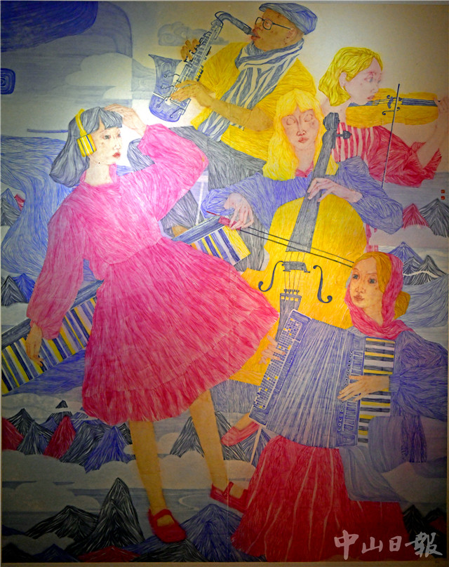 “例如《踏歌行》(作者 楊林),我們很難將其歸類到底是什么畫,很像我們小時(shí)候畫的圓珠筆畫,但是它給你的感覺就是悅目輕松的,仔細(xì)一看背景部分的山水云霧,它又是工筆畫的格調(diào)。