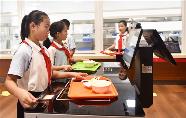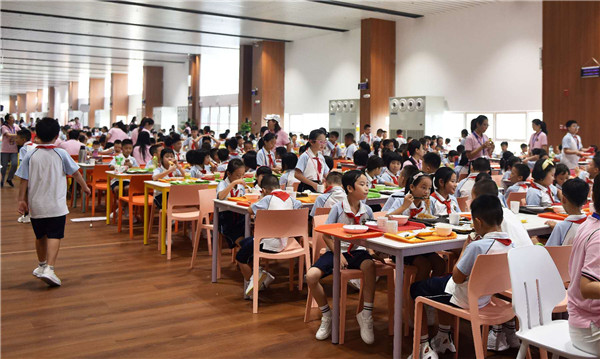升旗儀式結(jié)束后,記者跟隨該校學(xué)生,體驗了新學(xué)校開學(xué)第一天的日常。升旗儀式結(jié)束后,小學(xué)生們開始前往食堂用餐。面包、豆?jié){、油條、雞蛋、河粉……在食堂取餐臺上,一碟碟菜擺放整齊,學(xué)生在老師的指引下排隊按自己意愿取餐。取餐后,學(xué)生將托盤放至智慧餐臺,餐臺自動識別食物價格,學(xué)生刷臉即可支付。