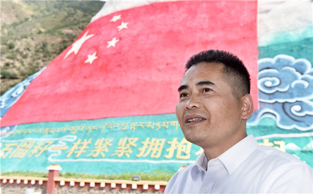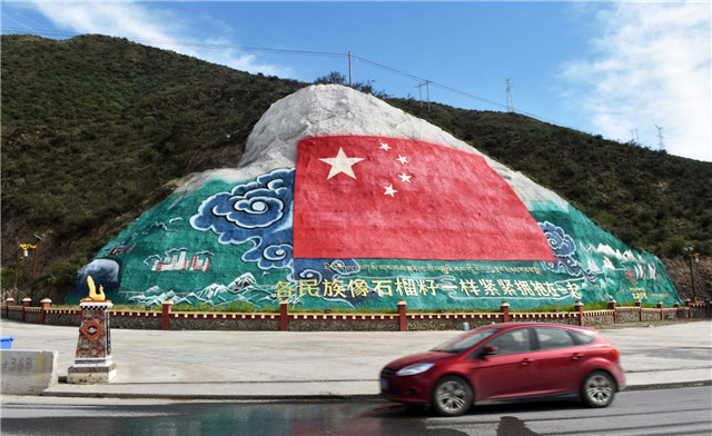 巴塘縣竹巴龍鄉(xiāng)水磨溝村,西望金沙江,東靠橫斷山脈,318國道穿村而過。隔幾百米遠就能看到318國道旁一幅繪在山體的巨幅巖壁畫。舒展的五星紅旗下,是祥云、草綠以及滾滾的金沙江水,最底下用漢藏兩種字體寫的金色大字:“各民族像石榴籽一樣 緊緊擁抱在一起”。