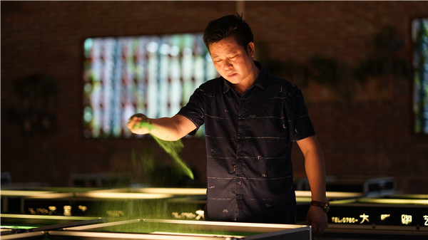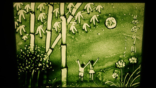 近日,在板芙鎮(zhèn)大盛陶藝共享文化館,沙畫師崔俊站在沙畫臺(tái)前手握細(xì)沙,在一揚(yáng)、一抹之間,竹林、圓月便活脫脫地呈現(xiàn)眼前,再用手在沙面上上下一揮,營造出夜色朦朧,通過光與影的變化,勾勒出人月兩團(tuán)圓的美好景象。