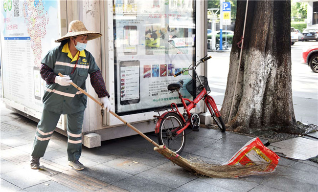 除了做好日常保潔工作,藍(lán)芳還要完成各類應(yīng)急任務(wù)。比如中山遭遇臺風(fēng)襲擊時,藍(lán)芳和其他環(huán)衛(wèi)工人要及時清理被臺風(fēng)刮斷的樹枝落葉等,每次臺風(fēng)過后,環(huán)衛(wèi)工人的工作量總會倍增?!坝浀糜幸淮闻_風(fēng)來臨,我們從凌晨工作到晚上九點(diǎn),全部人也沒怎么休息,直接吃了一個快餐又繼續(xù)開工,就這樣堅持了下來。”每次臺風(fēng)天氣后,藍(lán)芳總是沖在保潔工作一線,加班加點(diǎn)完成清潔工作。今年疫情期間,藍(lán)芳更是一天沒離開過工作崗位。