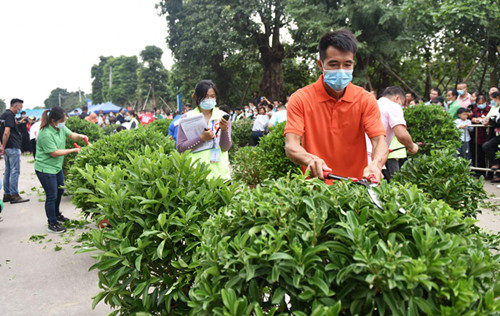 當(dāng)天,在花木基地舉行的比賽分別有園林植物辨識(shí)比賽、園林植物過盆比賽、園林植物修剪比賽、園林盆景修剪比賽和園林苗木運(yùn)卸接力賽等。