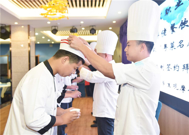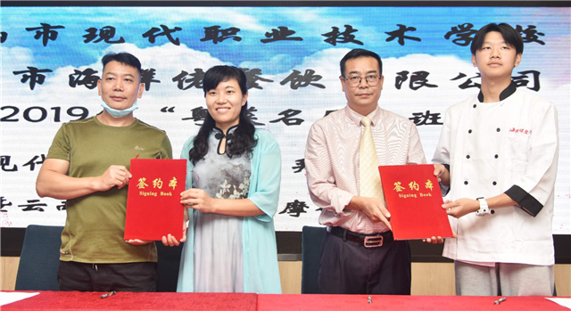 上述場(chǎng)景,是中山市現(xiàn)代職業(yè)技術(shù)學(xué)校與中山市海鮮佬餐飲有限公司共同舉辦的2019級(jí)“粵菜名廚”班現(xiàn)代學(xué)徒制簽約拜師儀式。
