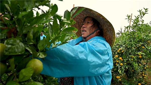 上午十點半,梁根祥正忙著將圓滾滾的皇帝柑裝箱打包,他的妻子披上雨衣,繼續(xù)走到泥濘的園中采摘鮮果,由于皇帝柑的顏色與樹葉類似,遠(yuǎn)處并不容易發(fā)現(xiàn)它的身影,但走進(jìn)一株株果樹時,便發(fā)現(xiàn)碩果已經(jīng)掛滿了枝頭。