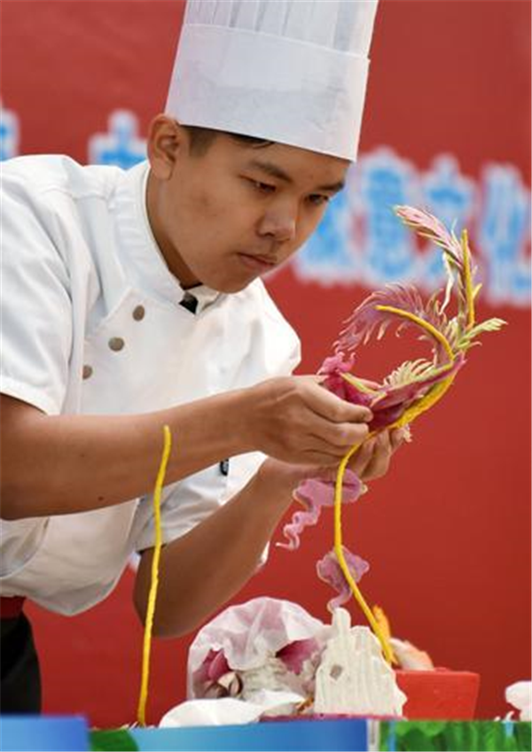 氣球上切土豆絲、蓑衣刀法切青瓜片、色彩繽紛果醬畫、惟妙惟肖果蔬雕刻、萌趣可愛(ài)手捏小面人、讓人眼花繚亂的花式調(diào)酒表演……12月4日上午,中山市現(xiàn)代職業(yè)技術(shù)學(xué)校教學(xué)成果暨粵菜師傅工程成果展在該校三鄉(xiāng)校區(qū)體育館內(nèi),烹飪專業(yè)的學(xué)生們紛紛走上舞臺(tái)展示自己的嫻熟技藝,引來(lái)觀眾陣陣喝彩。