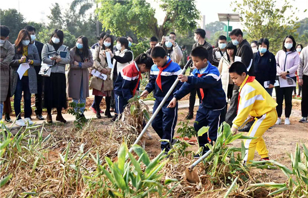 “鋤頭不行了,換鏟子!”“這也有,用手拔!”12月7日上午,大涌鎮(zhèn)旗北小學五(4)班的一群小學生,在老師帶領下正在學校勞動教育基地里收獲竹芋。三人一小組一邊干一邊商量,鋤頭鋤鏟子鏟,甚至直接下手扒拉,豐收干勁十足?!巴瘜O未解供耕織,也傍桑陰學種瓜。”古代詩人筆下的場景,重現(xiàn)在旗北小學。市教育工委、市教體局當天還在這里召開了全市中小學推進勞動教育現(xiàn)場會。