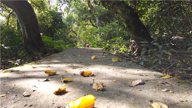 村中鳳凰木、鐵冬青、假蘋婆、香樟樹、南酸棗等樹木被低矮處寬闊的海芋葉、散發(fā)著清香的檸檬、紫褐色的蓖麻葉襯托著,共同護(hù)蔭村中的怡然愜意。