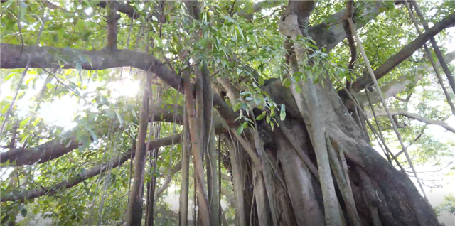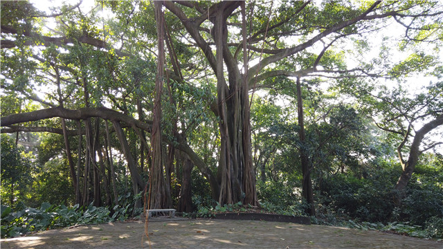 高大連綿的榕樹郁郁蔥蔥,深沉的主干櫛比排列著,纏繞著萬(wàn)縷算不得纖細(xì)的氣根,近看已具獨(dú)木成林之勢(shì),遠(yuǎn)觀時(shí)更是連成路邊成片的綠蔭、遮天蔽日,在天空中搭起枝葉橋梁來,如一徑透著迷離光影的蒼綠長(zhǎng)廊。