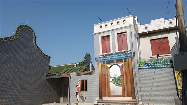 老舊的民宅與簇新的洋樓新舊并立,今昔輝映,祠堂邊民居墻壁上的墻繪在虛與實(shí)之間營(yíng)造出鄉(xiāng)村的盎然意趣。