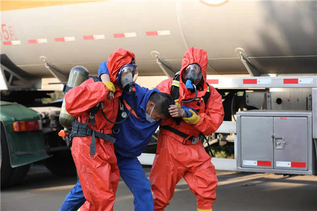當(dāng)天下午3點(diǎn)30分,緊密有序的演練隨著警報(bào)聲鳴響正式開始?,F(xiàn)場(chǎng)一輛空載柴油槽罐車追尾一輛滿載容積為52.6立方米的LNG天然氣槽罐車,事故導(dǎo)致天然氣槽罐車罐體尾部操作箱內(nèi)一處管道破裂,液態(tài)天然氣源源不斷流出。更可怕的是,事故現(xiàn)場(chǎng)距離人員密集區(qū)域最近距離不足100米,情形十分危險(xiǎn)。