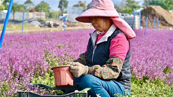 紫色的香妃草隨風(fēng)搖曳,粉紅的細葉美女櫻花姿動人,深綠色銀絨野牡丹花葉舒展……12月10日,記者走進民眾鎮(zhèn)新平村風(fēng)車園藝花木場,姹紫嫣紅、充滿生機的景象映入眼簾。