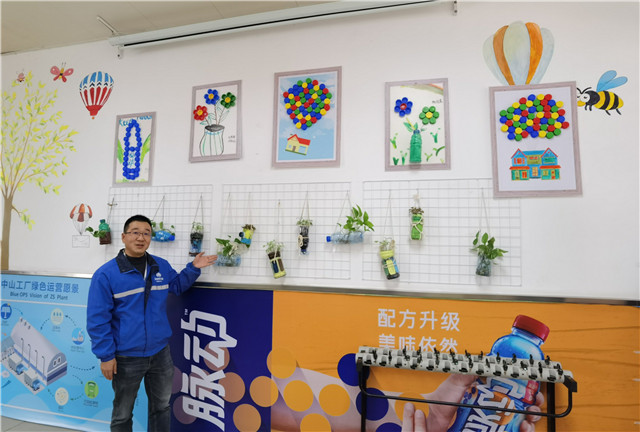 從高空中俯瞰工廠屋頂,一排排深藍色的光伏發(fā)電板整齊平鋪,在陽光下持續(xù)不斷地將光能轉(zhuǎn)化為電能;由廢舊二手脈動飲料瓶蓋、瓶子手工DIY的裝飾畫、綠植懸掛在飯?zhí)靡幻鎵ι希l(fā)著童趣小清新的氣息;廢棄的果汁鐵桶經(jīng)過再利用后變成一個個大花盆,從盆中伸出的爬墻虎爬滿了圍墻,綠意盎然......行走在工廠內(nèi),各種資源綜合利用的例子比比皆是,處處踐行著綠色發(fā)展理念。