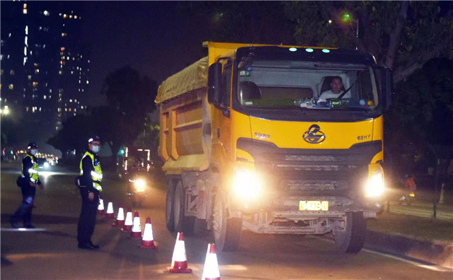 當(dāng)晚9時,聯(lián)合執(zhí)法行動小組在西區(qū)翠景道設(shè)卡,檢查途經(jīng)工程車車輛。