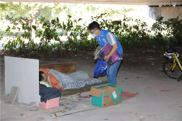 上午8時(shí)30分,記者跟隨其中一路救助站工作人員先后來到了獅滘口橋、汽車總站隧道口、橫欄帝景路附近,看到有流浪人員或蜷縮在橋墩下、或用簡(jiǎn)單的擋板和建筑廢料圍起了一個(gè)小空間,身上還披著前期市救助管理站“寒冬送溫暖”專項(xiàng)救助活動(dòng)送去的保暖棉被和暖冬衣物。