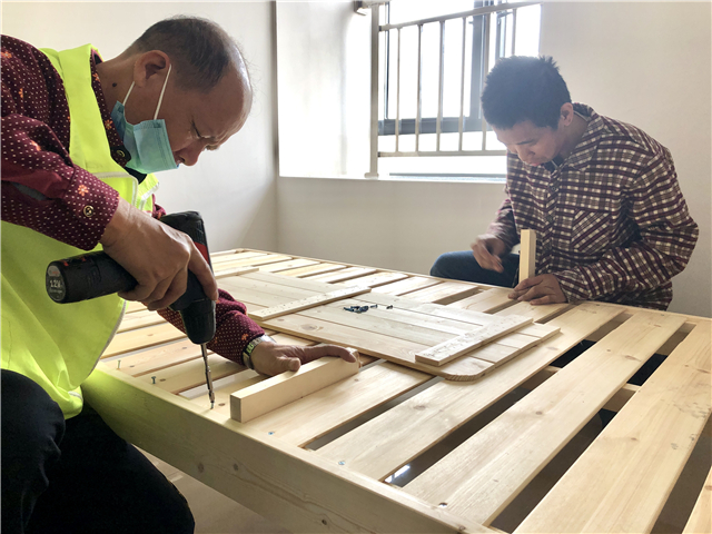 去年12月底才搬入祈安苑居住的云姐家中沒有太多家具,阿雄此行就是為她安裝社工鏈接到的一張木床。從包中掏出各式各樣的工具,阿雄利索地開始工作,而陳洪滔則在一旁與云姐話起家常。
