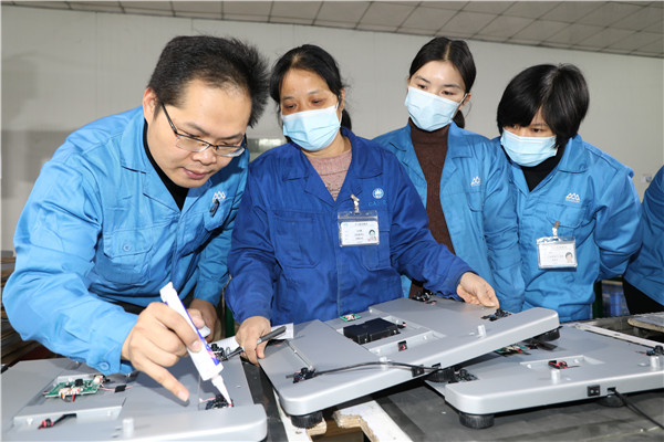 1月8日上午,廣東香山衡器集團股份有限公司(以下簡稱香山股份)的裝配廠車間,公司總裁王咸車和其他多位公司高管、技術崗、行政崗二十多名黨員干部,正在一條拉線上當裝配工。