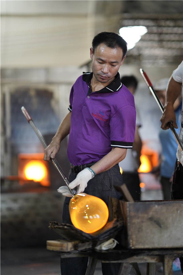 ▲在橫欄鎮(zhèn)一玻璃燈具生產(chǎn)車間,有一群“身懷絕技”的人“玻璃人”。