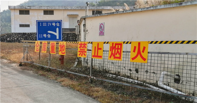 一進(jìn)入中山市煙花爆竹有限公司煙花爆竹倉(cāng)庫(kù)區(qū)大門(mén),側(cè)邊墻壁貼著的“倉(cāng)庫(kù)重地 禁止煙火”醒目標(biāo)語(yǔ)映入眼簾,抬眼朝山上望去,只見(jiàn)半山坡錯(cuò)落有致地分布著四個(gè)存儲(chǔ)倉(cāng)庫(kù),倉(cāng)庫(kù)間彼此相隔一段安全距離。據(jù)悉,該庫(kù)區(qū)原為西山村石場(chǎng)礦區(qū),占地面積為7925.1㎡,內(nèi)含4棟倉(cāng)庫(kù),總建筑面積為3496㎡,分別用于存儲(chǔ)不同等級(jí)的煙花爆竹成品。