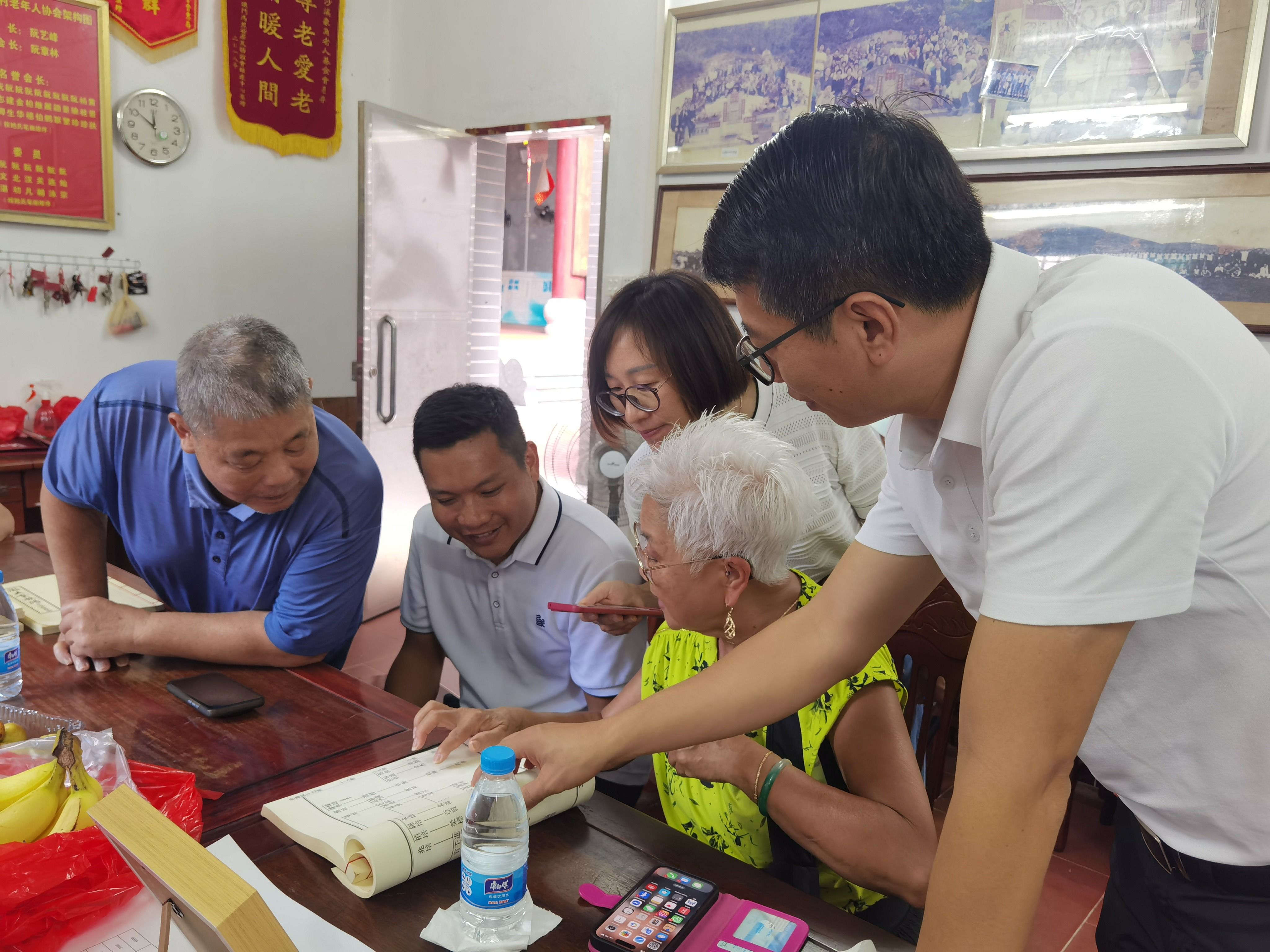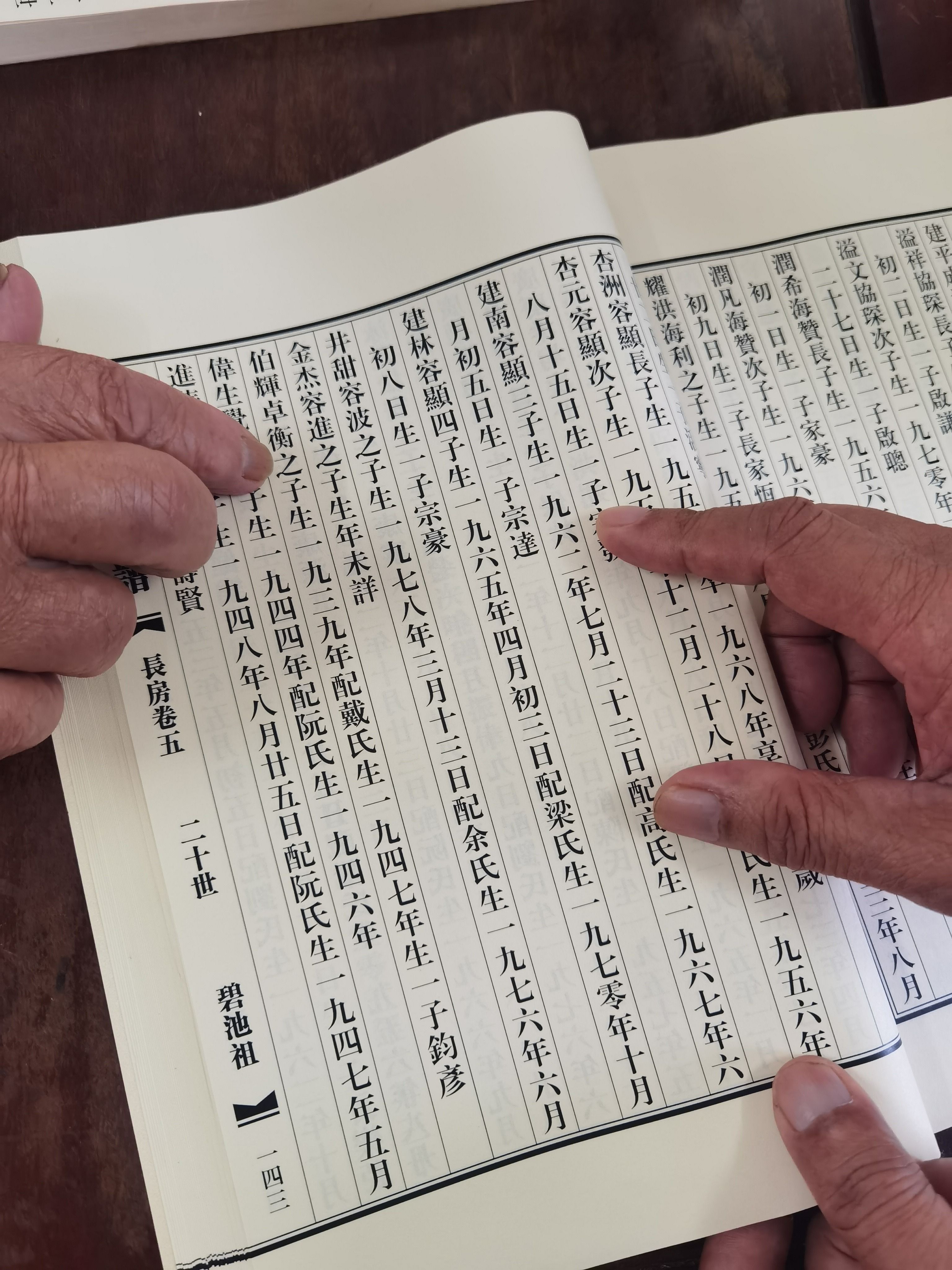 “2017年那次回鄉(xiāng),我終于在族譜內(nèi)找到了家族成員的名字。”阮桂銘笑著回憶。上一次回鄉(xiāng)是2019年,但每次見到族譜,她都會愛不釋手,忍不住再細(xì)細(xì)翻閱,指尖輕撫那些熟悉的名字。族譜上長長的名單,宛如一條蜿蜒百年的河流。 “這個是我堂哥阮伯輝,這個就是我侄子阮鈞彥……” 她用標(biāo)準(zhǔn)的隆都話與我們一一介紹。