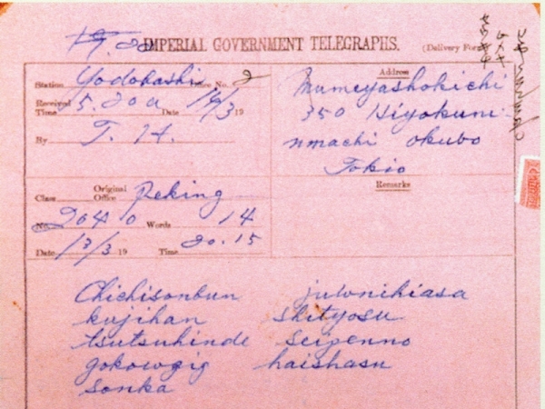 萱野長(zhǎng)知從北京致梅屋莊吉電告知孫中山的病情