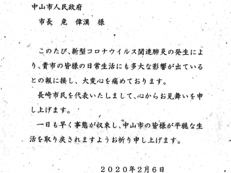 長(zhǎng)崎市市長(zhǎng)田上富久致中山市的慰問(wèn)信及譯文