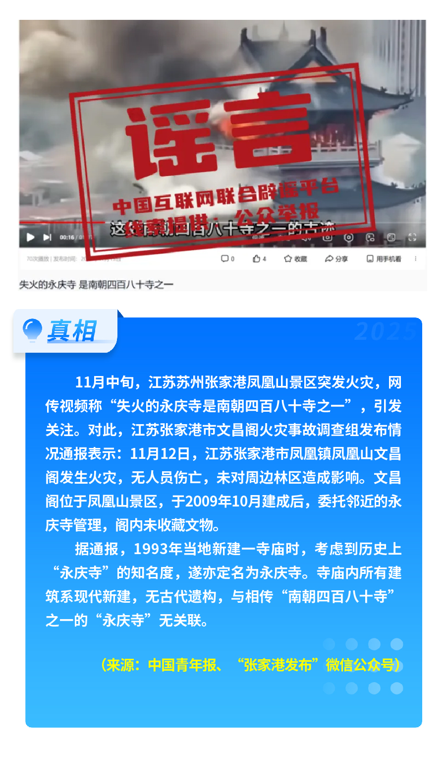 社會熱點(diǎn)事件被歪曲蹭炒。首屆“蘇超”聯(lián)賽泰州隊(duì)奪冠后,“冠軍獲五十萬獎金、城市地圖放大字號”等謠言流傳,以夸張信息博眼球、引流量;江蘇張家港鳳凰山景區(qū)火災(zāi)后,“‘南朝四百八十寺之一’被燒”的謠言引發(fā)熱議,通報顯示失火建筑為2009年新建,與歷史上的南朝寺廟無關(guān)聯(lián)。